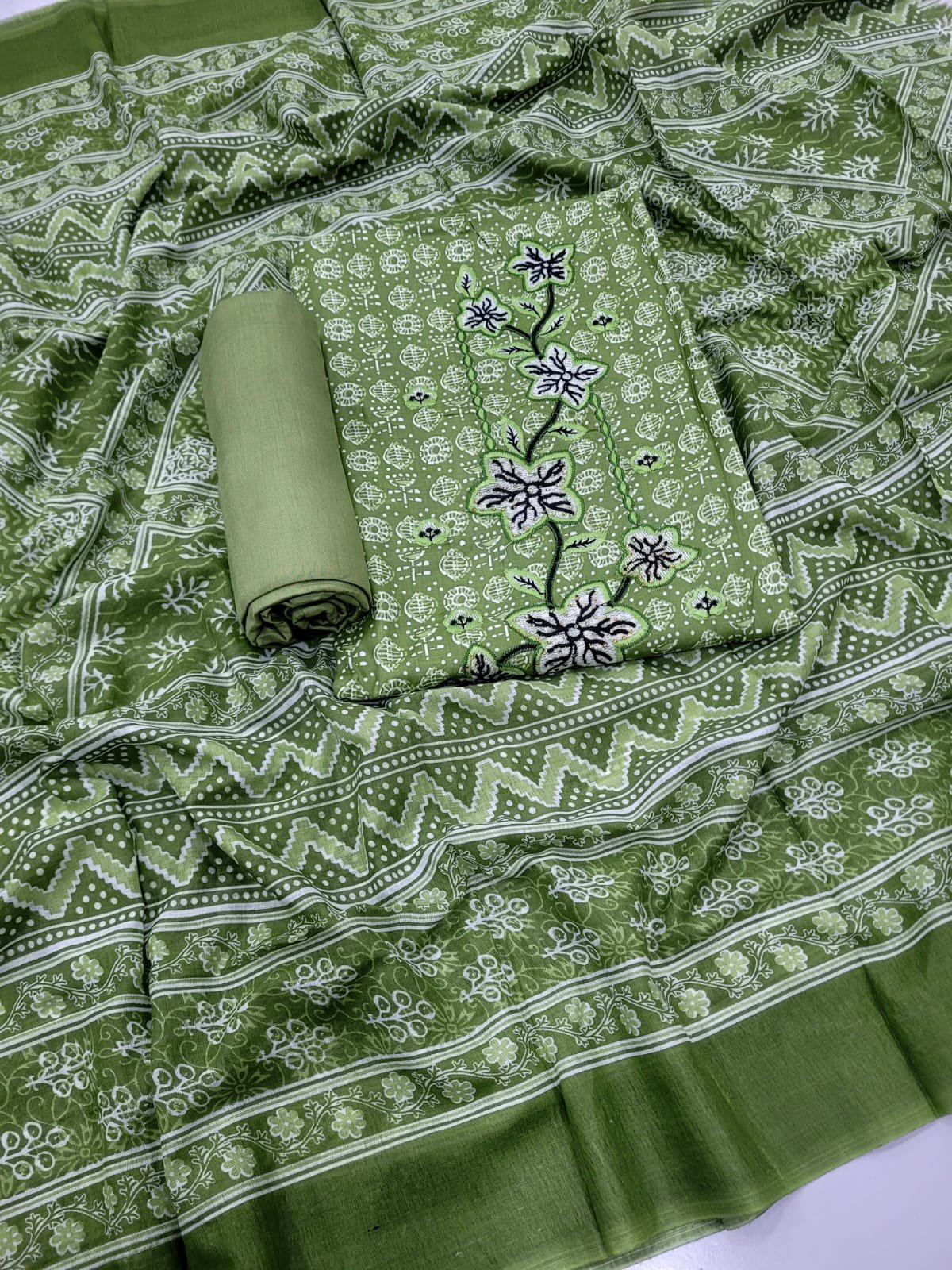 Beautiful design prints, soft cotton unstitched salwar material with floral Embroidery Work Design on front portion adds extra essence to the Fabric