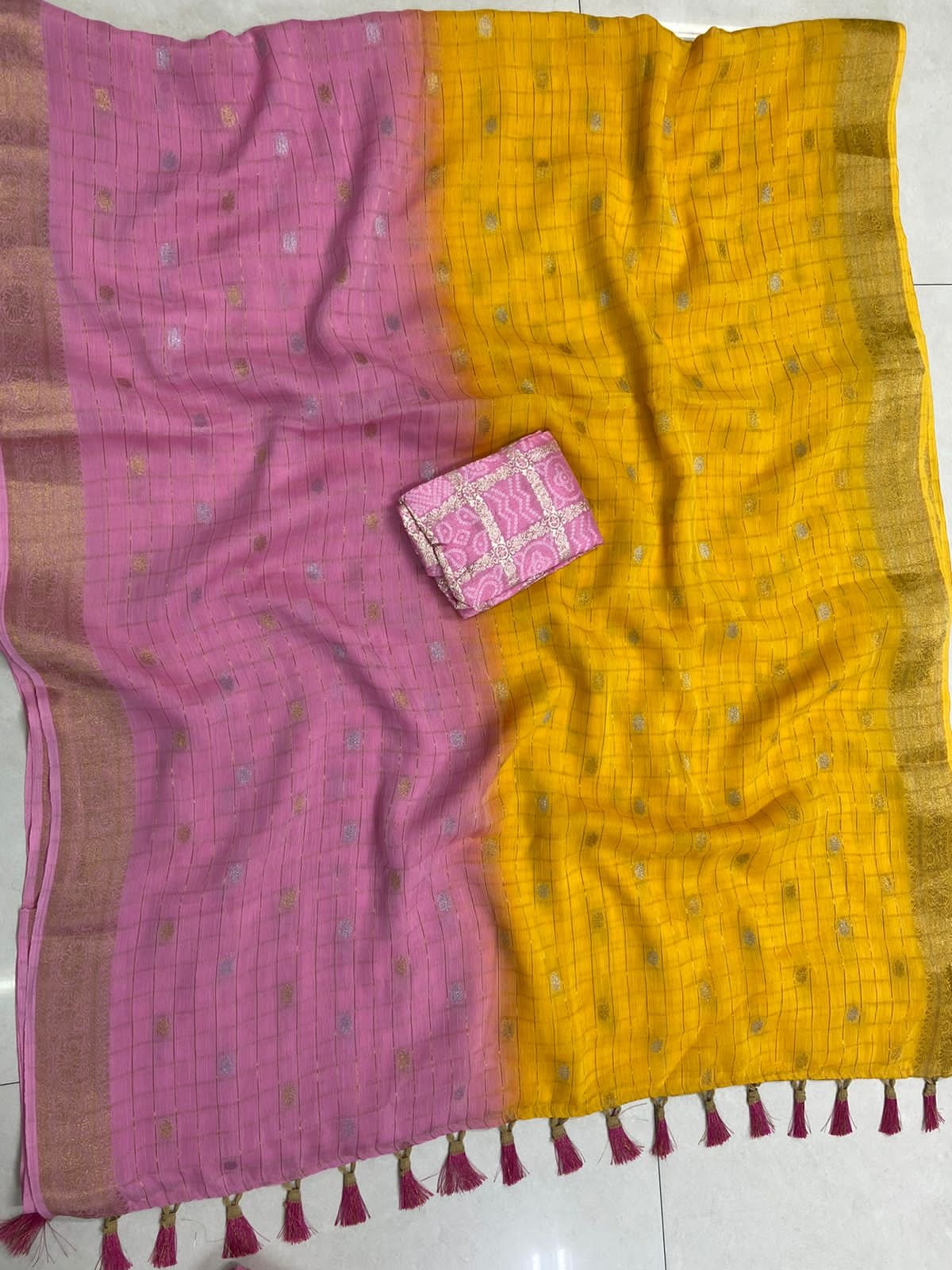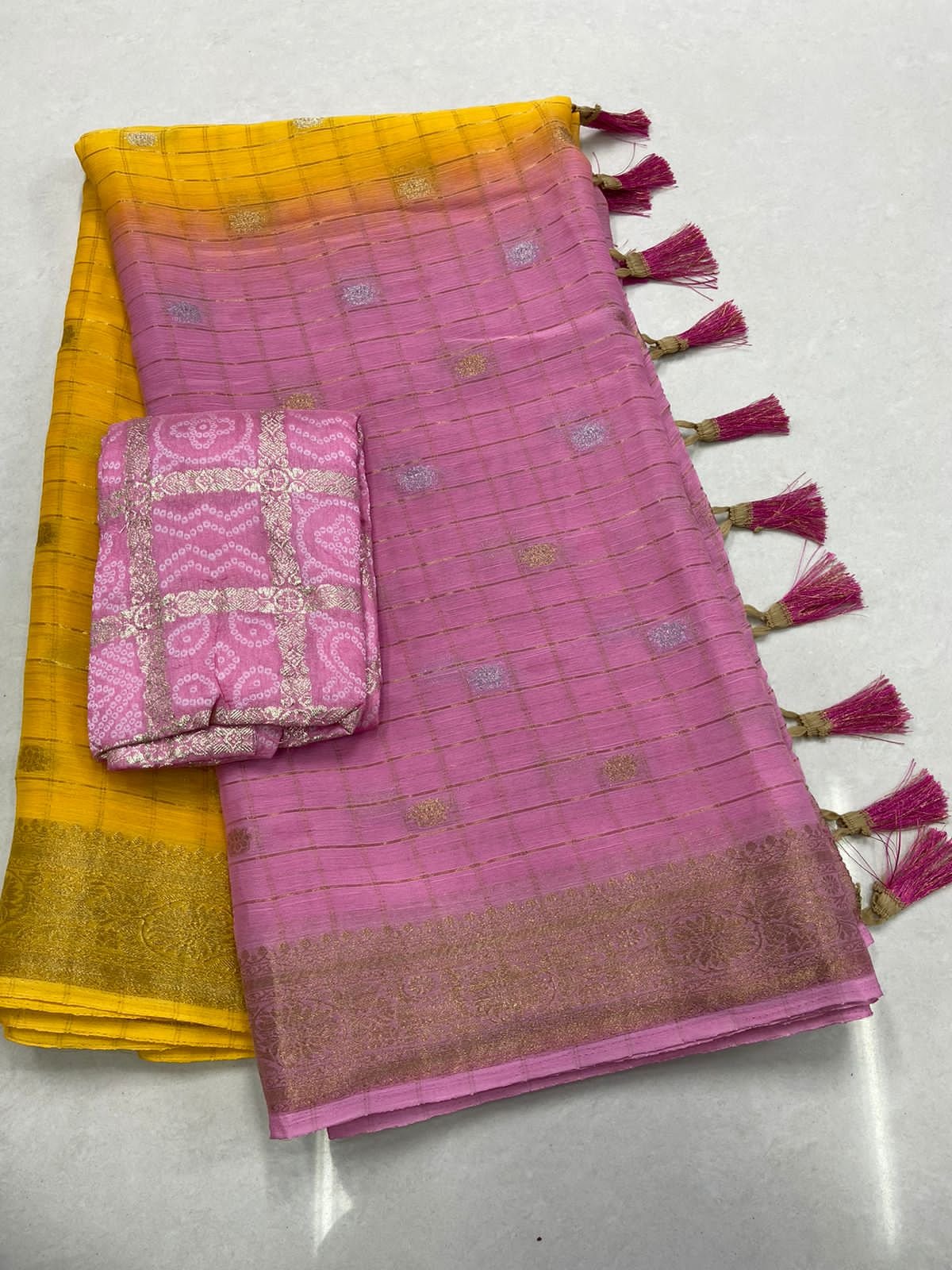 Two Pastel tones with lovely Leheriya Zari Checks & buttas allover the Sarees