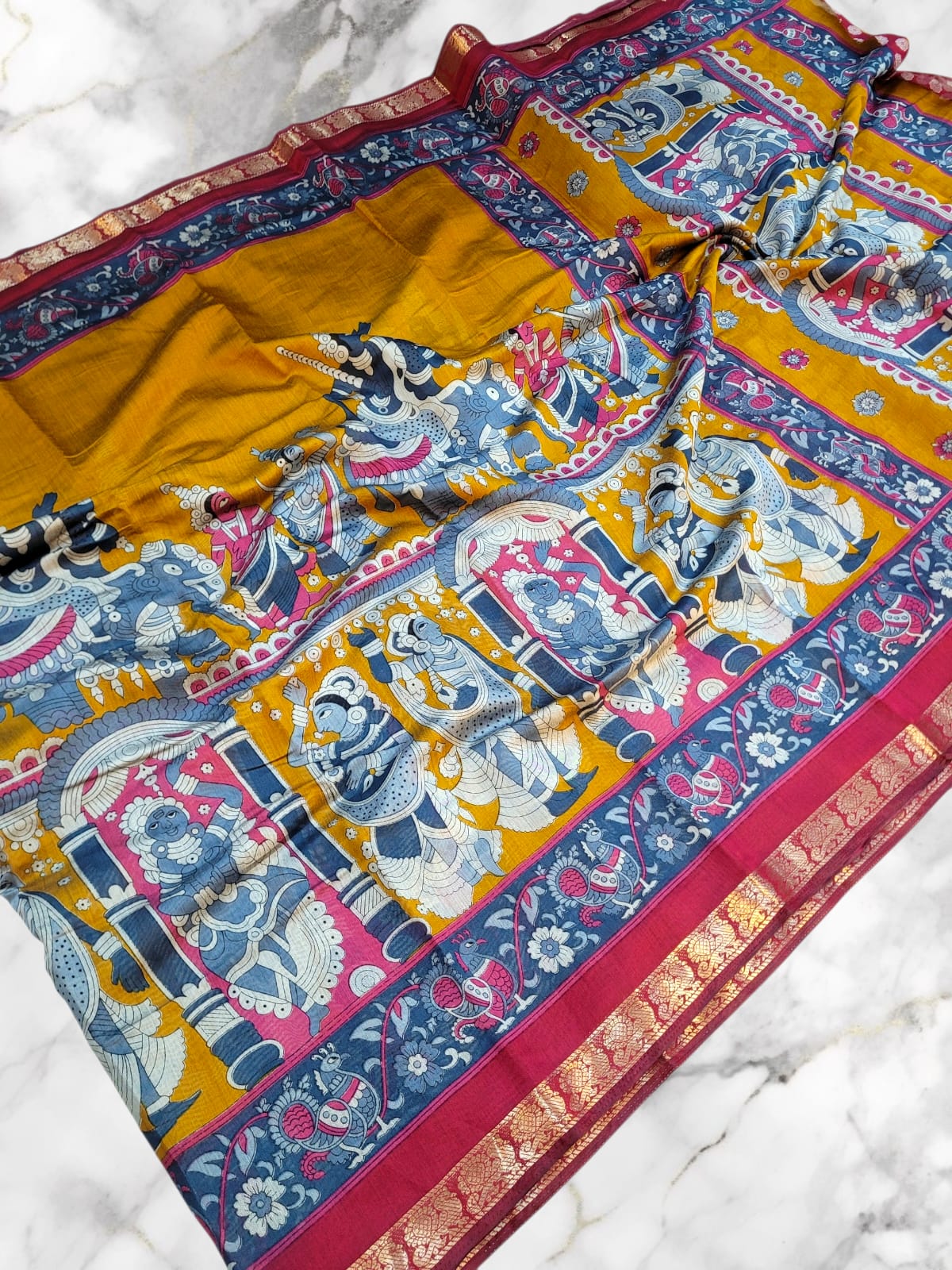 This beautiful traditional cotton saree has an attractive kalamkari print pattern with traditional motifs in vibrant colours