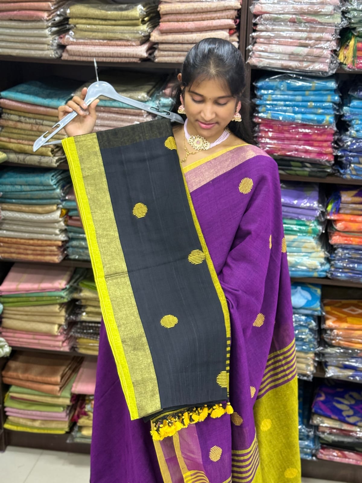 With Contrast pallu along with designer tassels & Contrast Blouse