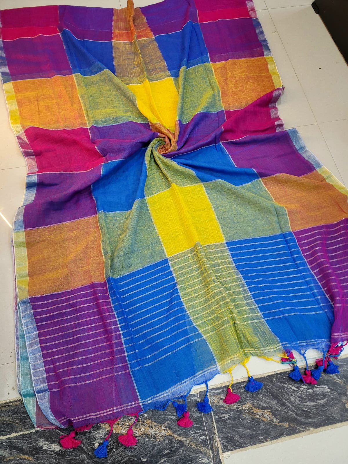Multi Colored Checked Handloom Linen Saree