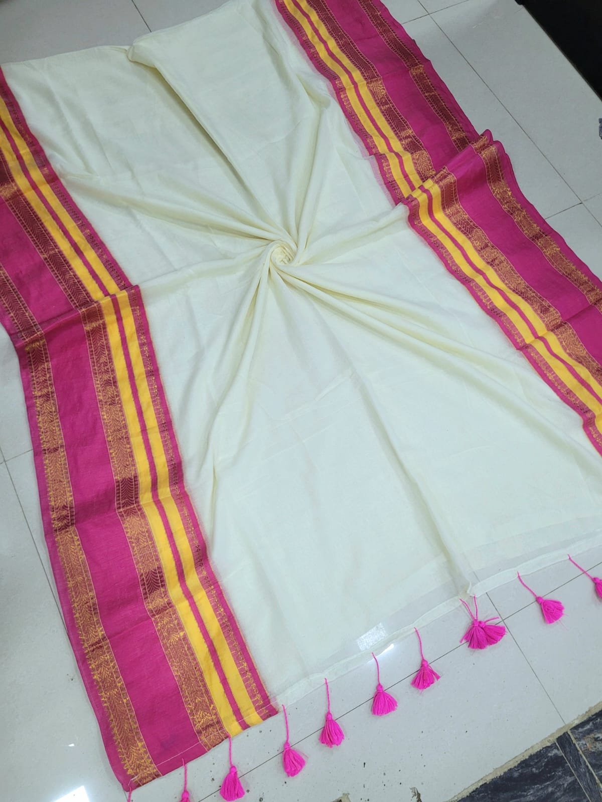 Handmade tassels on the pallu.