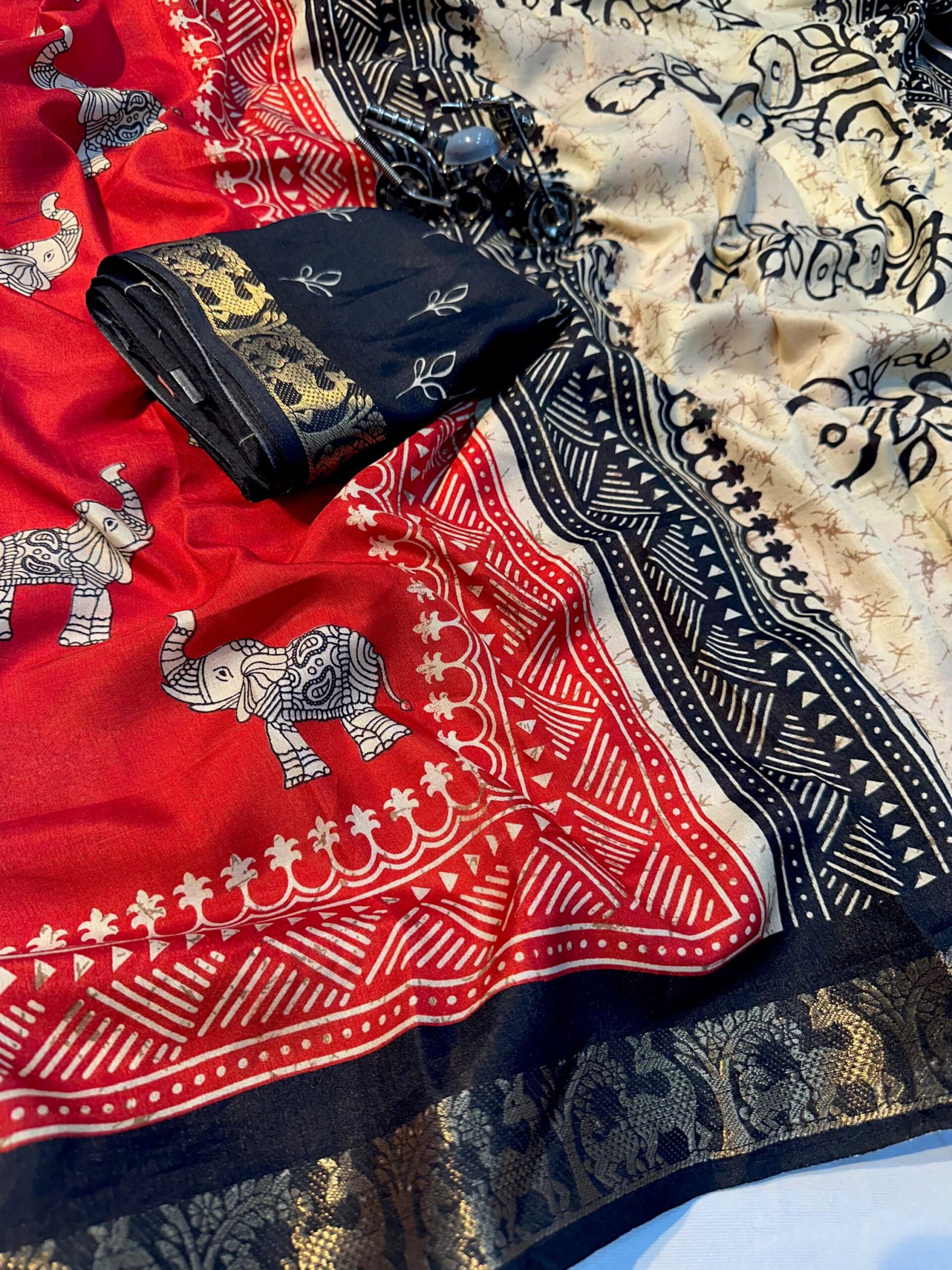 This beautiful silk saree has an attractive kalamkari print pattern with traditional motifs in vibrant colours