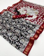 A striking pallu and contrasting blouse piece enhance the saree’s beauty and elegance