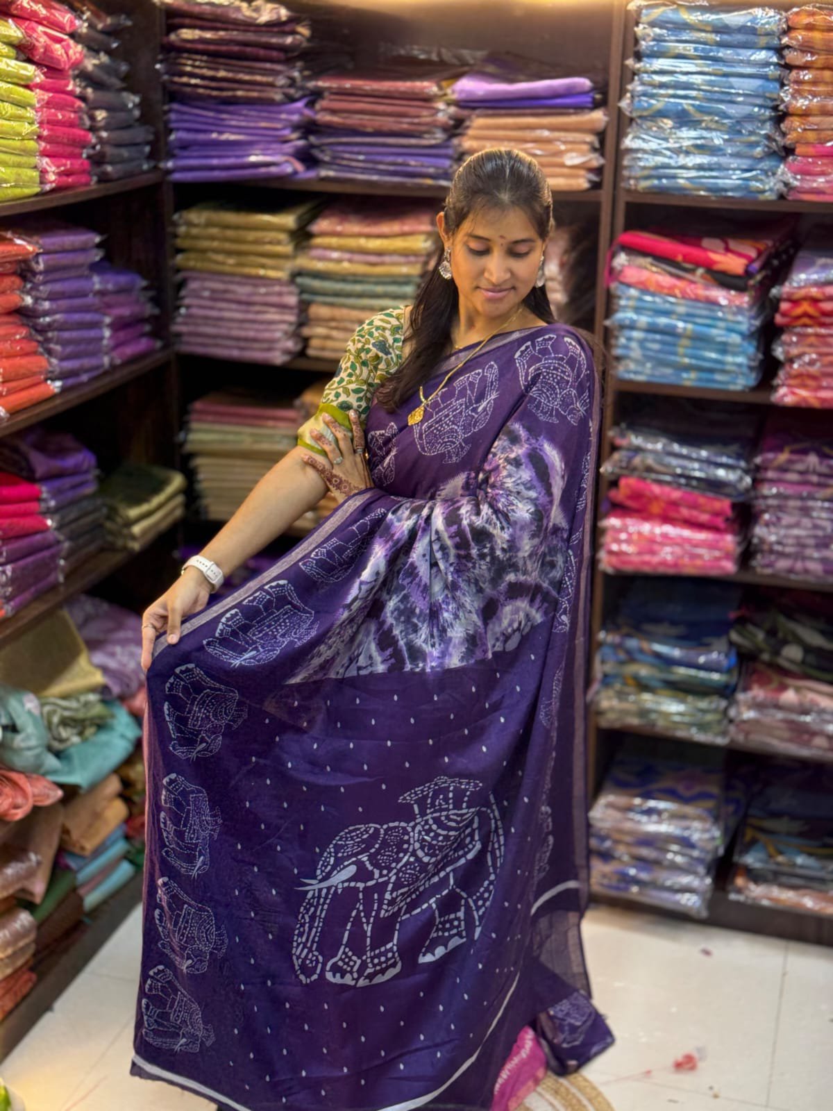 A striking pallu and contrasting blouse piece enhance the saree’s beauty and elegance