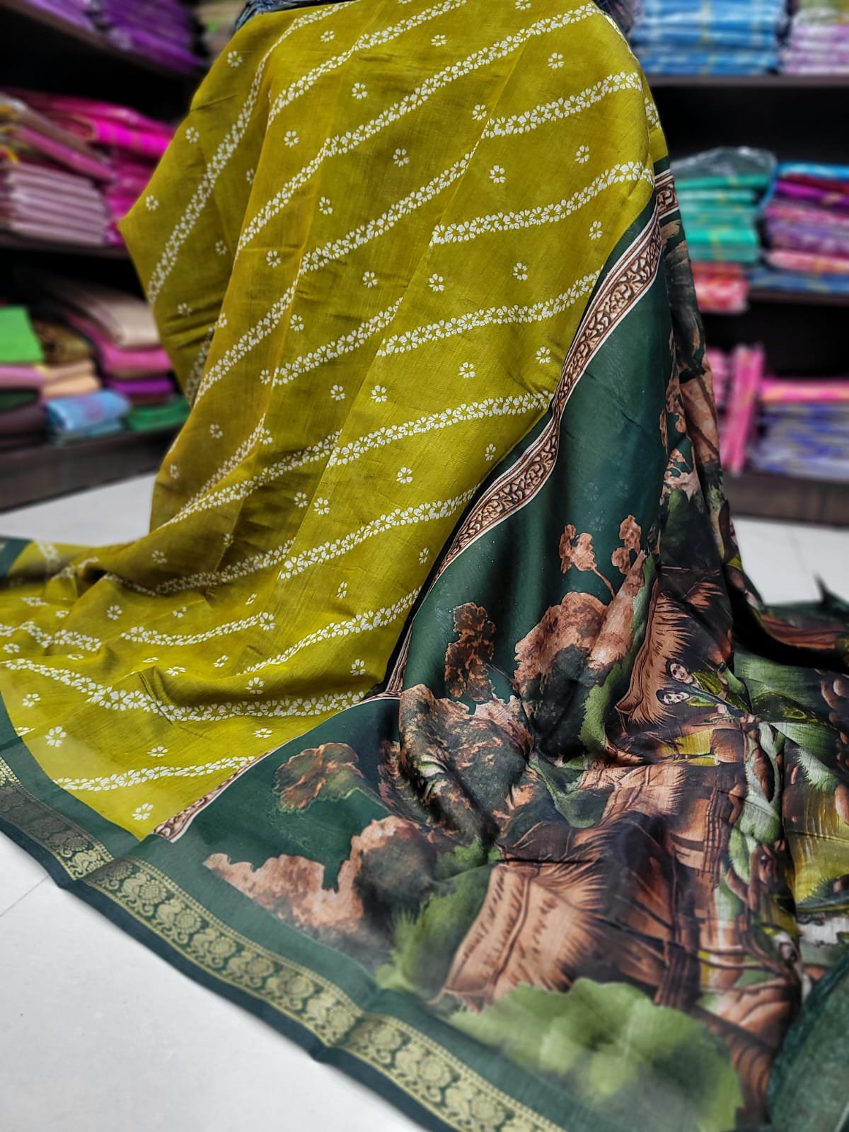 This beautiful cotton saree has an attractive kalamkari print pattern with traditional motifs in vibrant colours